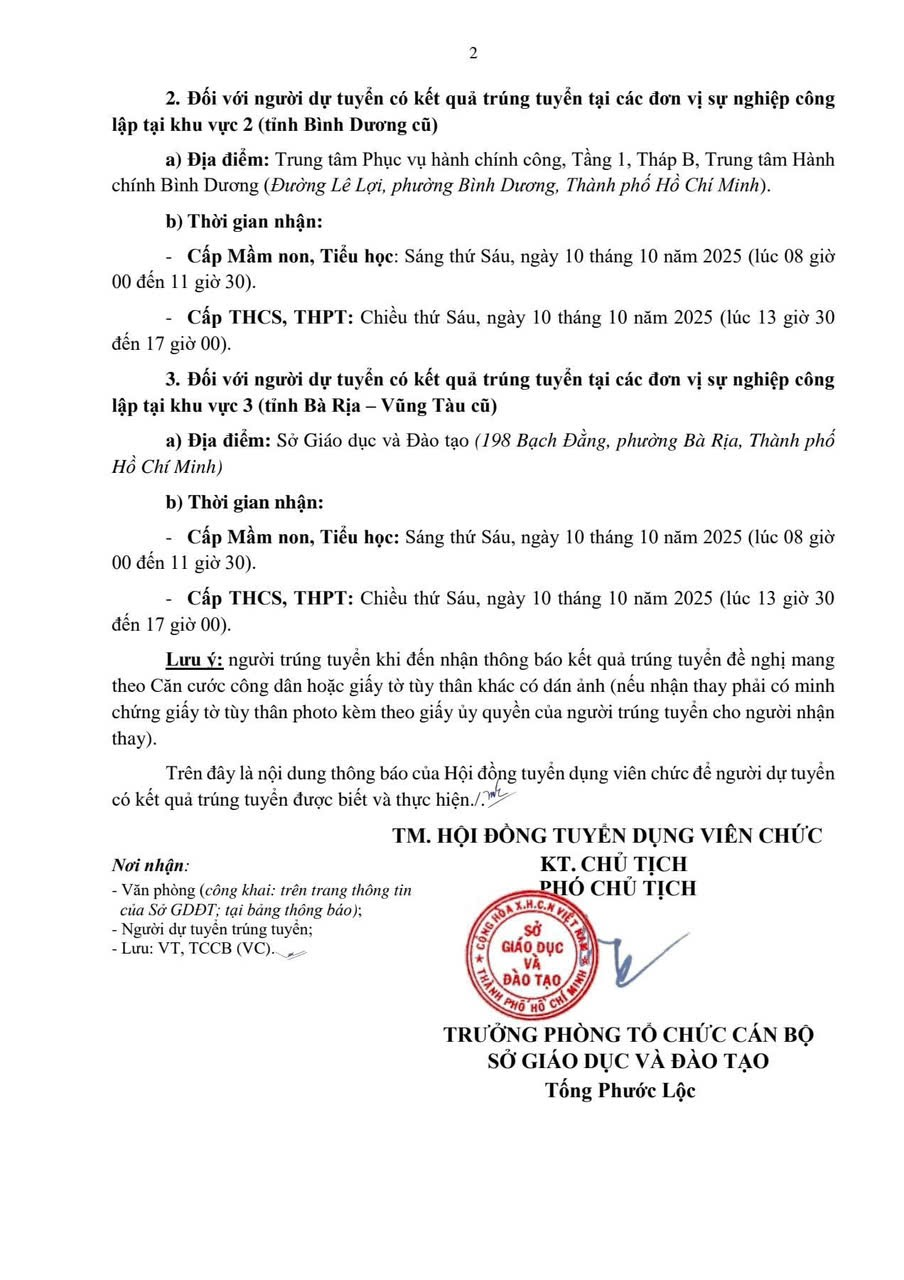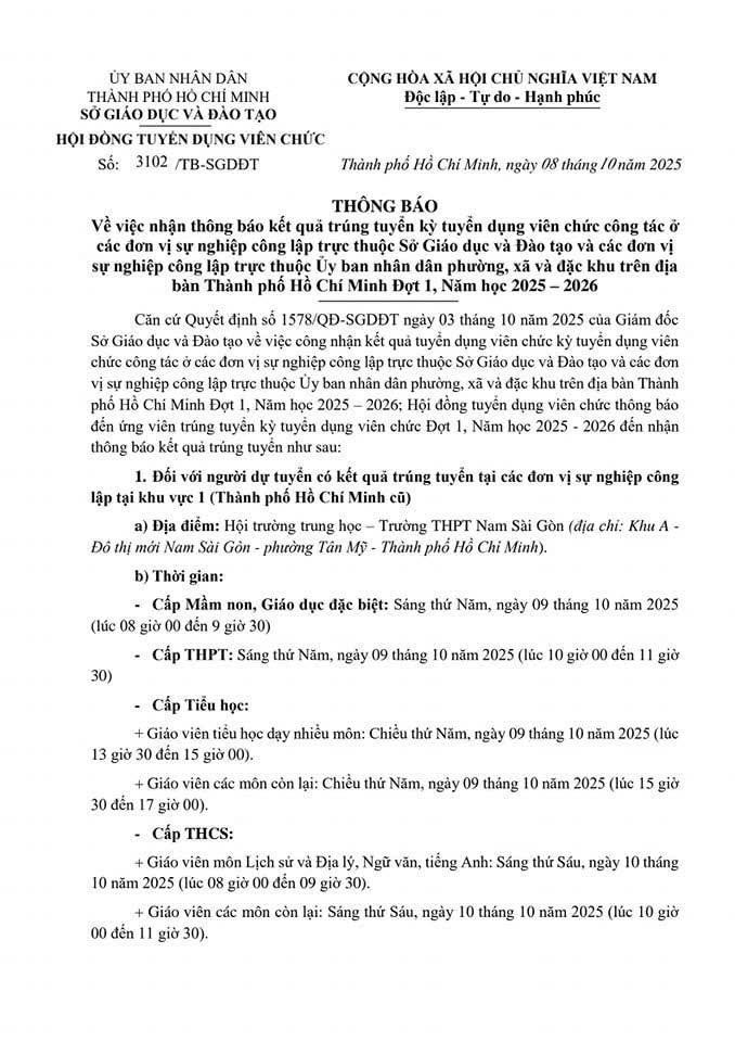 Thông báo kết quả trúng tuyển kỳ tuyển dụng viên chức công tác ở các đơn vị sự nghiệp công lập trực thuộc Sở Giáo dục và Đào tạo và các đơn vị sự nghiệp công lập trực thuộc Ủy ban nhân dân phường, xã và đặc khu trên địa bàn Thành phố Hồ Chí Minh Đợt 1, Năm học 2025 – 2026