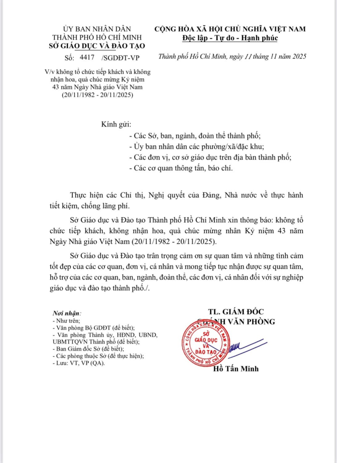 Trường Mầm Non Hoa Lan xin Thông Báo không tổ chức tiếp khách, không nhận hoa, quà chúc mừng Kỷ niệm 43 năm Ngày Nhà giáo Việt Nam ( 20/11/1982- 20/11/2025)