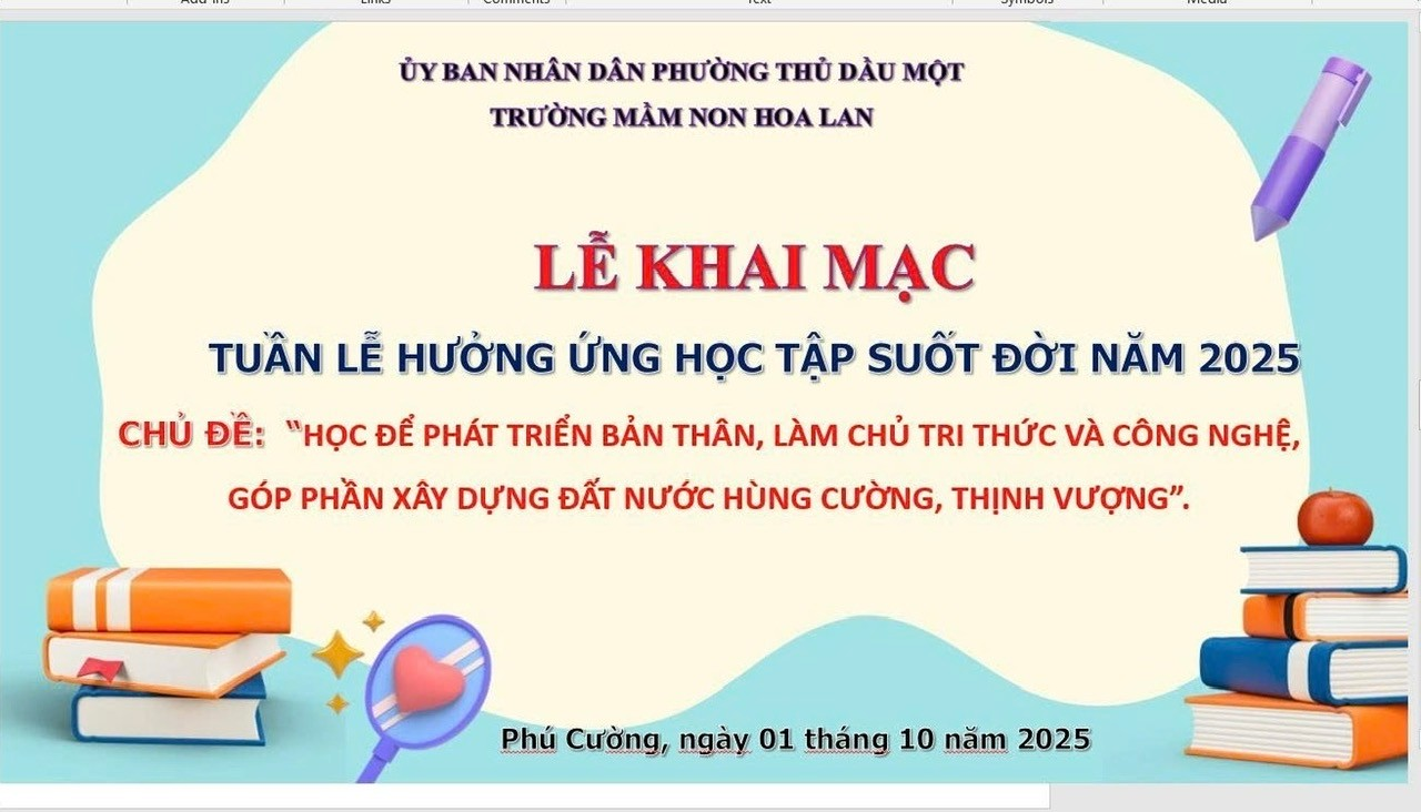Trường MN Hoa Lan Lễ Khai Mạc "Tuần lễ hưởng ứng học tập suốt đời năm 2025" với Chủ đề “ Học để phát triển bản thân, làm chủ tri thức và công nghệ, góp phần xây dựng đất nước hùng cường, thịnh vượng.”